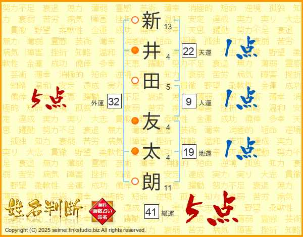 新(13画)井(4画)田(5画) 友(4画)太(4画)朗(11画)
