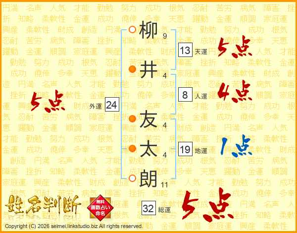 柳(9画)井(4画) 友(4画)太(4画)朗(11画)