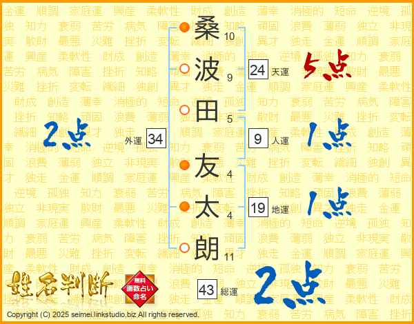 桑(10画)波(9画)田(5画) 友(4画)太(4画)朗(11画)