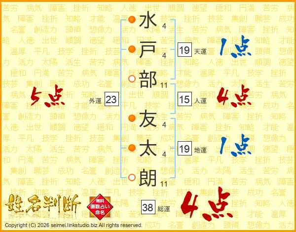 水(4画)戸(4画)部(11画) 友(4画)太(4画)朗(11画)
