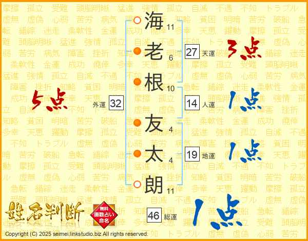 海(11画)老(6画)根(10画) 友(4画)太(4画)朗(11画)