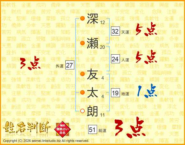 深(12画)瀬(20画) 友(4画)太(4画)朗(11画)