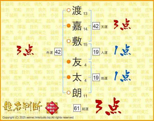 渡(13画)嘉(14画)敷(15画) 友(4画)太(4画)朗(11画)
