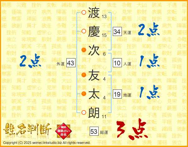 渡(13画)慶(15画)次(6画) 友(4画)太(4画)朗(11画)