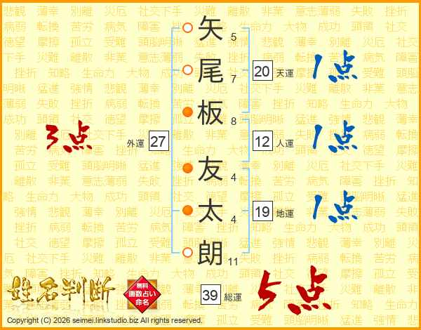 矢(5画)尾(7画)板(8画) 友(4画)太(4画)朗(11画)