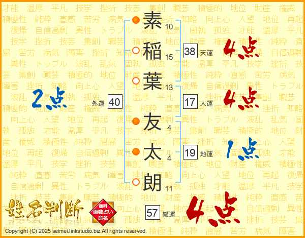素(10画)稲(15画)葉(13画) 友(4画)太(4画)朗(11画)