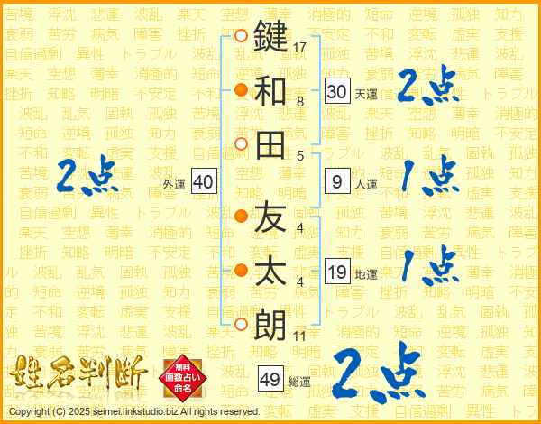 鍵(17画)和(8画)田(5画) 友(4画)太(4画)朗(11画)