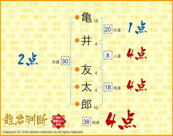 亀井友太郎さんの総運は38画の4点!