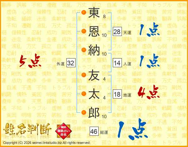 東(8画)恩(10画)納(10画) 友(4画)太(4画)郎(10画)