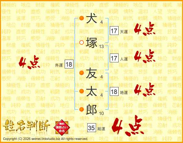犬(4画)塚(13画) 友(4画)太(4画)郎(10画)