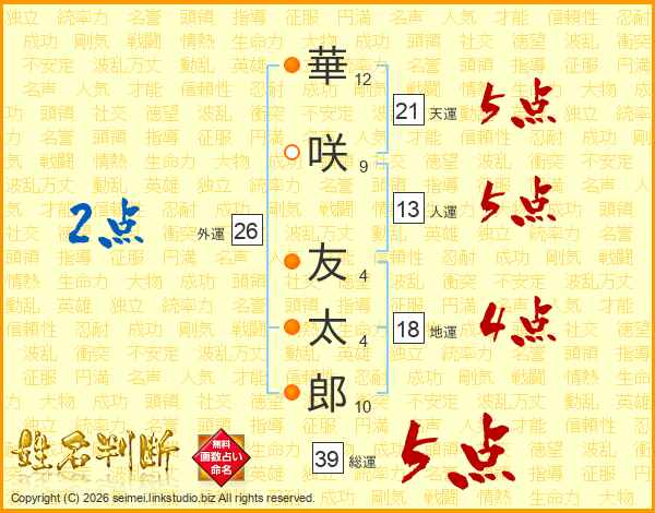 華咲友太郎さんの総運は39画の5点!
