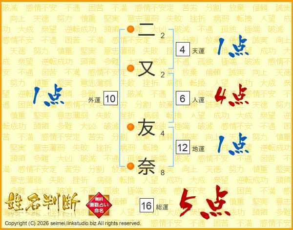 二又友奈さんの総運は16画の5点!
