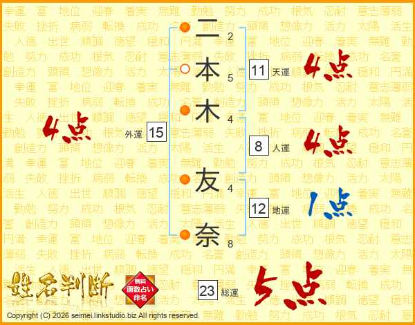 二本木友奈さんの総運は23画の5点!