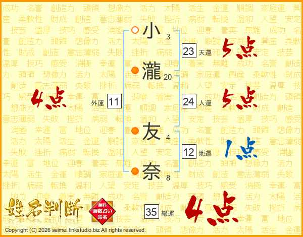 小(3画)瀧(20画) 友(4画)奈(8画)