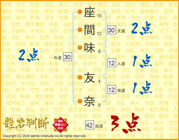 座(10画)間(12画)味(8画) 友(4画)奈(8画)