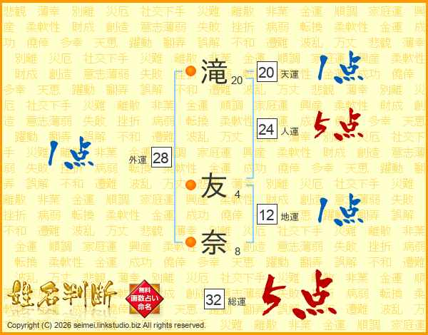 生活面を象徴する運勢です。外部から受ける影響力を表し、結婚運、家庭運や職場、環境への順応性を表します。総運から人運を引いた画数。姓や名が1文字の場合を除く。