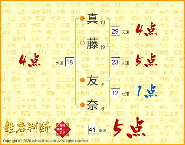 あなたの人生を表す1番重要な運勢です。生涯を通じて影響する総合運となり、主に50歳以降の晩年期に影響を及ぼします。苗字と名前の合計画数。