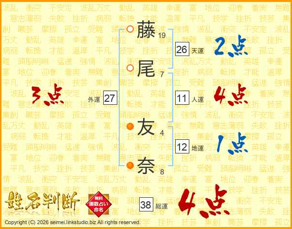 藤(19画)尾(7画) 友(4画)奈(8画)