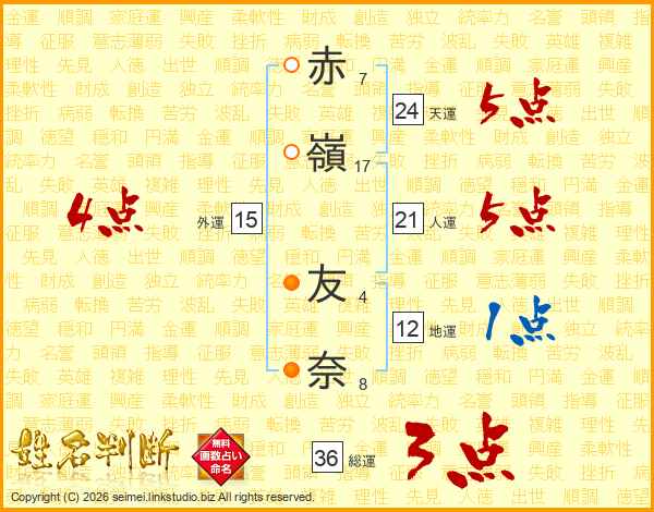 赤(7画)嶺(17画) 友(4画)奈(8画)