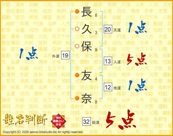 長(8画)久(3画)保(9画) 友(4画)奈(8画)