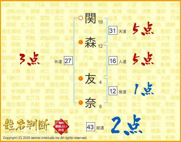 関森友奈さんの総運は43画の2点!