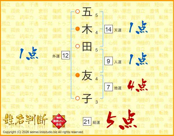 生活面を象徴する運勢です。外部から受ける影響力を表し、結婚運、家庭運や職場、環境への順応性を表します。総運から人運を引いた画数。姓や名が1文字の場合を除く。
