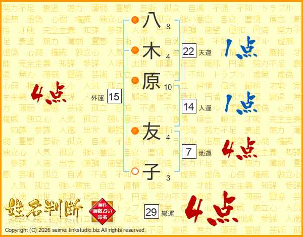 八(8画)木(4画)原(10画) 友(4画)子(3画)