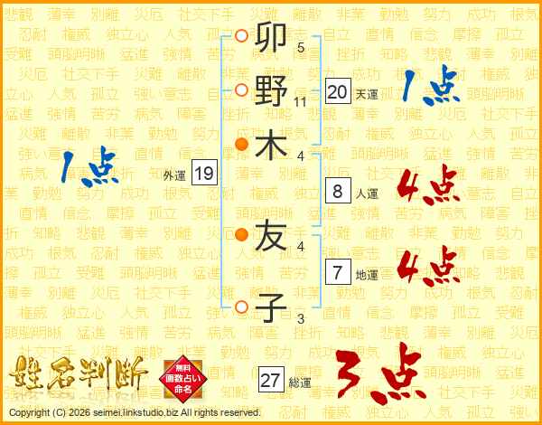 卯(5画)野(11画)木(4画) 友(4画)子(3画)