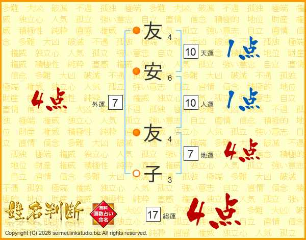 生活面を象徴する運勢です。外部から受ける影響力を表し、結婚運、家庭運や職場、環境への順応性を表します。総運から人運を引いた画数。姓や名が1文字の場合を除く。