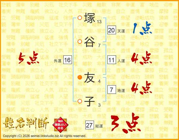 塚(13画)谷(7画) 友(4画)子(3画)