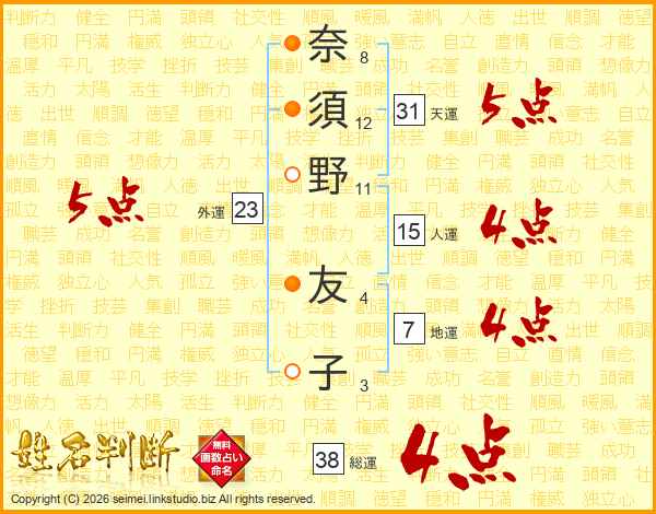 奈須野友子さんの総運は38画の4点!