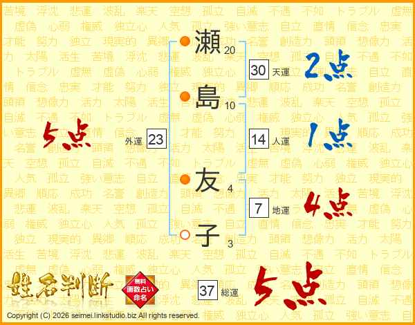 生活面を象徴する運勢です。外部から受ける影響力を表し、結婚運、家庭運や職場、環境への順応性を表します。総運から人運を引いた画数。姓や名が1文字の場合を除く。