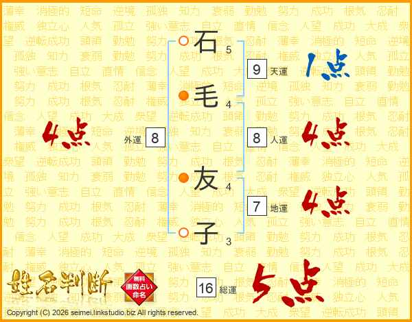 生活面を象徴する運勢です。外部から受ける影響力を表し、結婚運、家庭運や職場、環境への順応性を表します。総運から人運を引いた画数。姓や名が1文字の場合を除く。