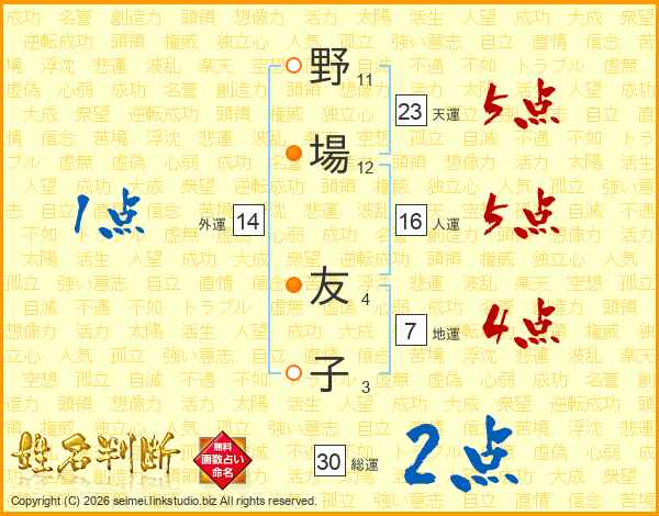 生活面を象徴する運勢です。外部から受ける影響力を表し、結婚運、家庭運や職場、環境への順応性を表します。総運から人運を引いた画数。姓や名が1文字の場合を除く。