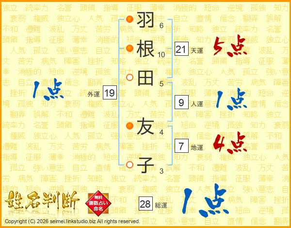 羽(6画)根(10画)田(5画) 友(4画)子(3画)