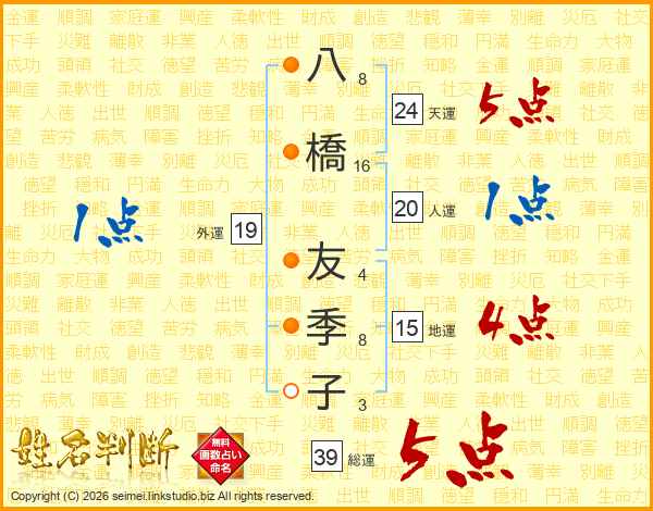 八(8画)橋(16画) 友(4画)季(8画)子(3画)