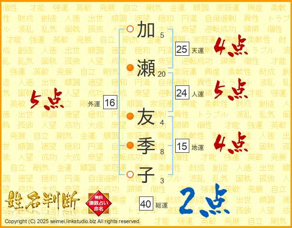 加瀬友季子さんの天運は25画の4点!