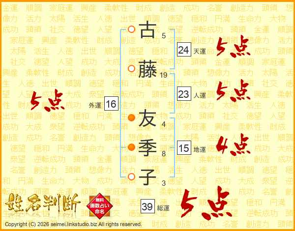 古藤友季子さんの総運は39画の5点!