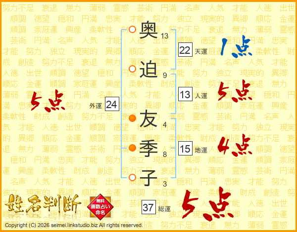 奥(13画)迫(9画) 友(4画)季(8画)子(3画)