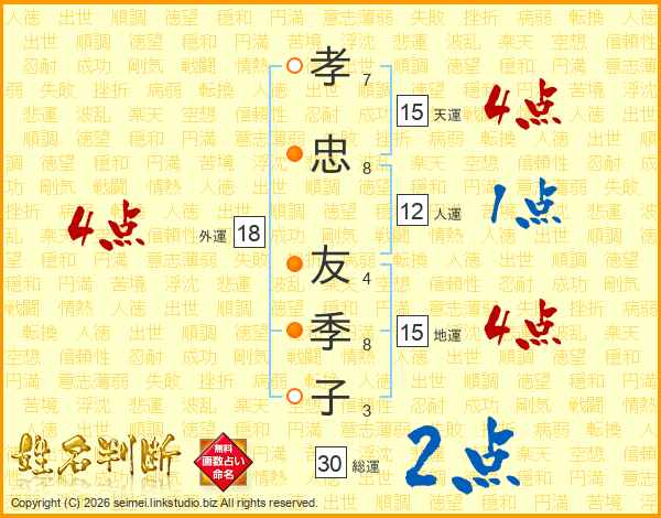 孝(7画)忠(8画) 友(4画)季(8画)子(3画)