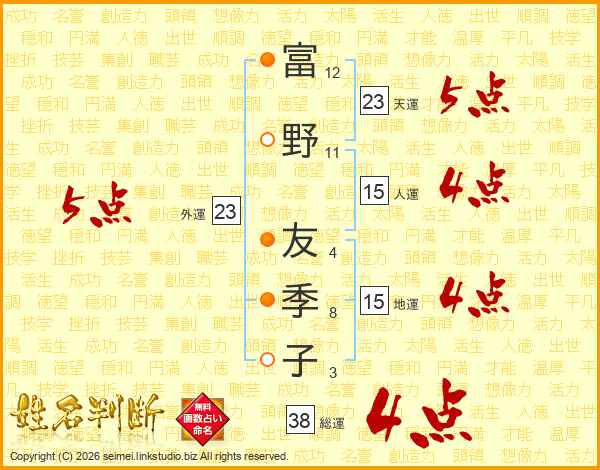 富(12画)野(11画) 友(4画)季(8画)子(3画)