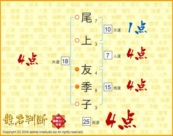 尾(7画)上(3画) 友(4画)季(8画)子(3画)