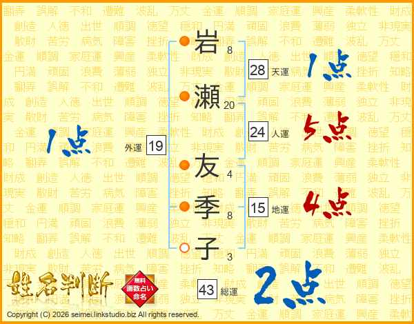岩(8画)瀬(20画) 友(4画)季(8画)子(3画)
