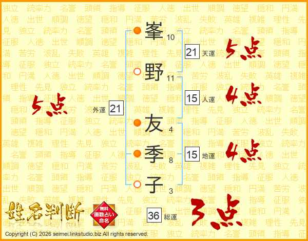 峯(10画)野(11画) 友(4画)季(8画)子(3画)