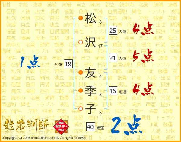 松(8画)沢(17画) 友(4画)季(8画)子(3画)