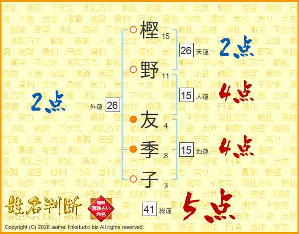 樫(15画)野(11画) 友(4画)季(8画)子(3画)