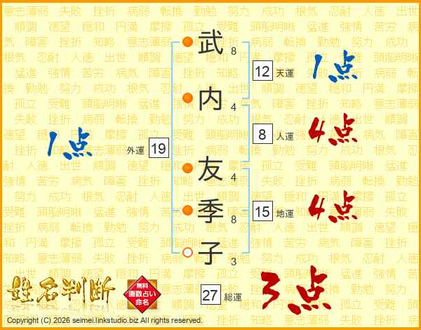 武(8画)内(4画) 友(4画)季(8画)子(3画)