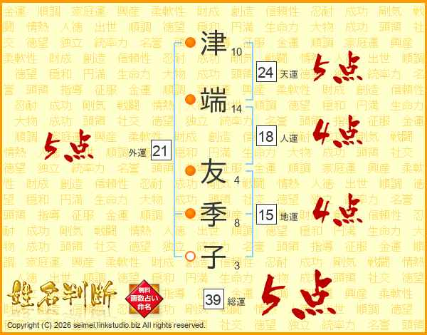津(10画)端(14画) 友(4画)季(8画)子(3画)