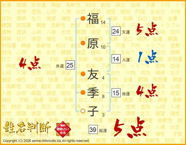 福(14画)原(10画) 友(4画)季(8画)子(3画)
