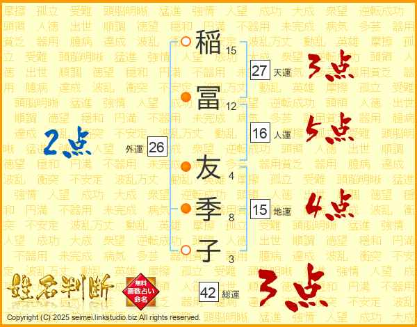 稲(15画)冨(12画) 友(4画)季(8画)子(3画)